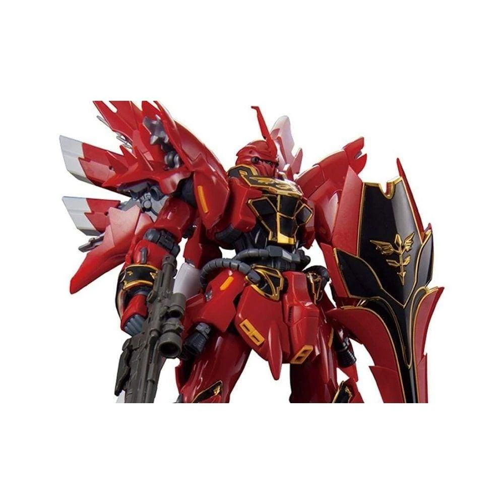The crimson Mobile Suit Sinanju, piloted by the leader of the Sleeves, Full Frontal, has finally launched in the RG line-up! The model includes movable rear-mounted thrusters, which are based on the thrust control mechanisms of real rocket engines and internal skeletal detailed from drawings by Hajime Katoki. The texture of the brilliant gold engravings have been faithfully recreated as individual parts while the its main body is made in a glossy red plastic.Â