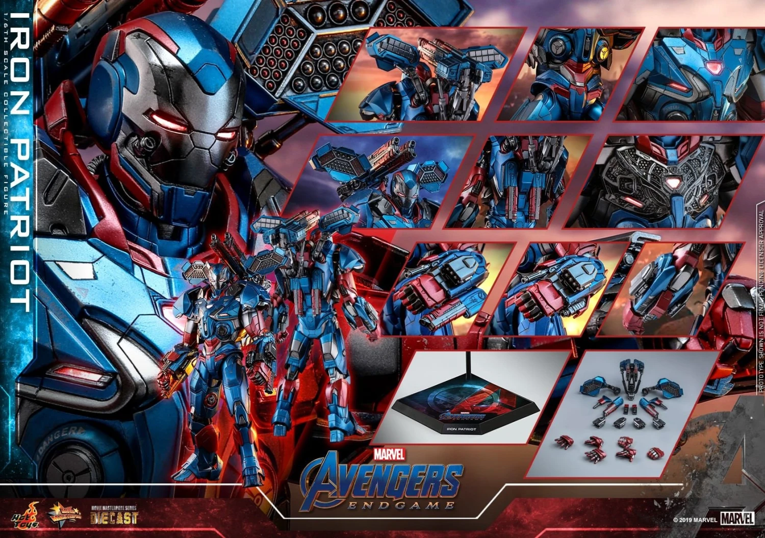 This highly-accurate diecast collectible figure is specially crafted based on the appearance of Don Cheadle as James Rhodes/Iron Patriot in Avengers: Endgame. This figure features two interchangeable heads including a newly developed head sculpt with remarkable likeness as well as a helmeted head with LED light-up function. The Iron Patriot features metallic blue and reddish-orange painted armor with streamlined armor design, LED light-up chest Arc Reactor and repulsors, articulated weapons featuring back-mounted cannons and shoulder-mounted missile launchers, and a specially designed Avengers: Endgame themed figure base.
