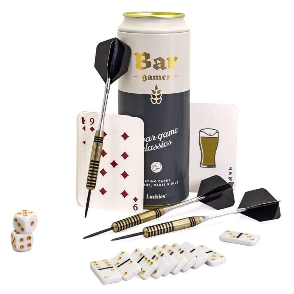 Bar Room classics to turn an ordinary night into the ultimate fun and games. Includes a deck of cards, a domino set, a 5 pack of dice and a set of 3 darts.