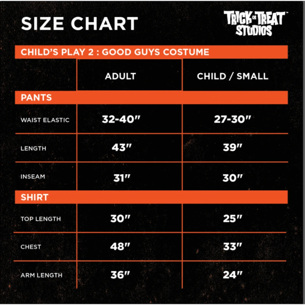 The Child’s Play 2 Deluxe Good Guys Costume size chart is shown in the product images.Â