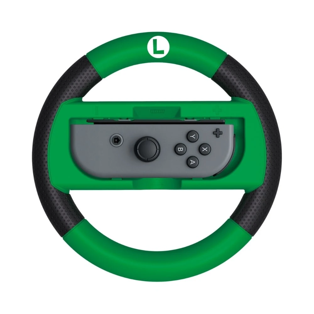 Officially Licensed by Nintendo. Blaze through Mario Kart 8 deluxe’s exciting courses with this full-sized Premium racing wheel attachment. Simply pop your Nintendo Switch Joy-Con Controller (sold separately) into the racing wheel attachment and enjoy more realistic control and better grip. A larger sized wheel for better control, complimented by a luxurious rubber grip and large and responsive shoulder summarys sets this racing wheel apart from the rest. Luigi themed colors and Logos, this racing wheel is perfect for Mario Kart fans!