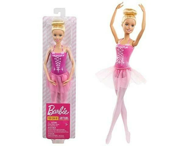 Barbie  has blue  eyes and  beautiful blonde hair pulled into a neat bun on top of her head. In this issue, Barbie is a ballerina , so she is dressed in a classic outfit – a purple bodysuit, a pink tutu skirt, tights and ballet flats (the elements of the outfit are not removable). Her hands and feet are shaped in such a way as if the doll is in the middle of a ballet performance.     Â
