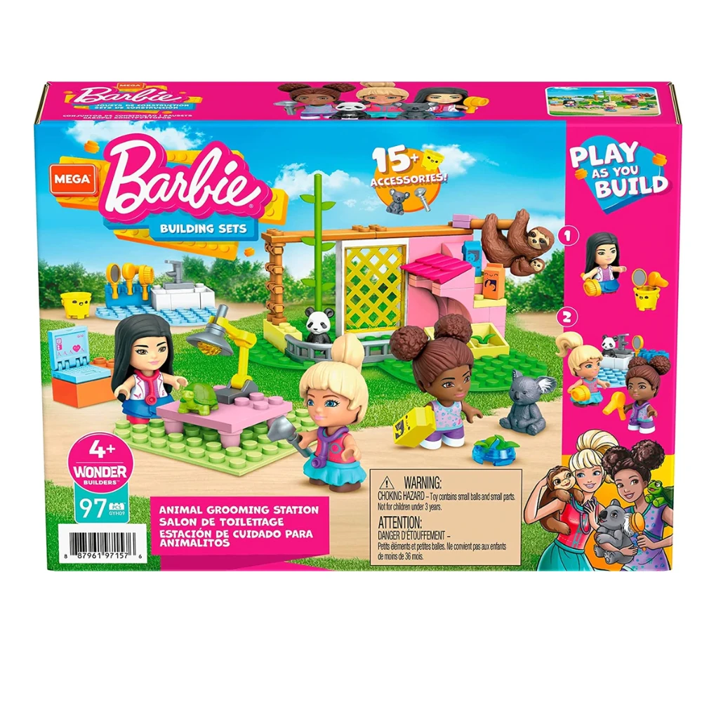 You can be anything when you help 3 Barbie micro-dolls at the Animal Grooming Station. Discover the nurturing world of animal care and play as you build the grooming, feeding and examination stations equipped with roleplay accessories like a brush, water bowl, stethoscopes and more. Working at the Animal Grooming Station is fun when you play with adorable animals like a panda, turtle, koala, sloth and baby sloth. Designed for beginners, this building set is easy to build and offers storytelling play with every step of building. Ideal for Wonder Builders, ages 4 and up