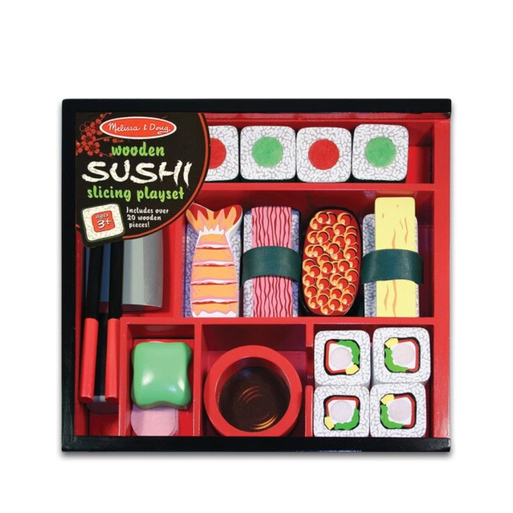 Add wasabi, if you like! This elegant 24-piece wooden sushi set is packed in a beautiful storage box and includes sliceable sushi rolls, shrimp, tuna, easy-use chopsticks, a cleaver and more! Sushi rolls make realistic chopping sounds when sliced!