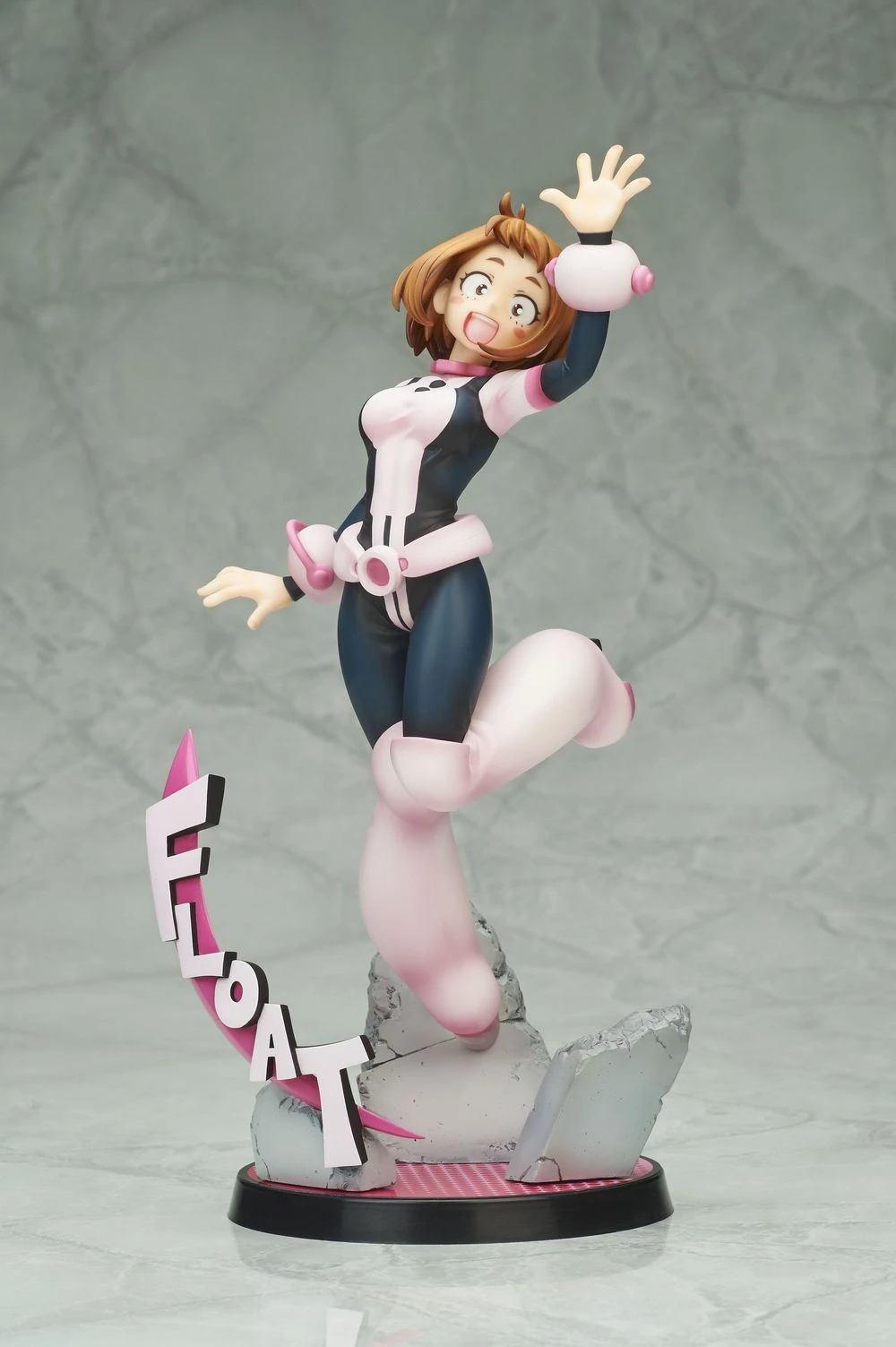 The sweet and cheerful main heroine of “My Hero Academia” has been transformed into a 1/8th scale figure! Ochako Uraraka comes dressed in her pink and black hero suit, wearing a big smile on her face as she waves while floating in the air. She comes with a base covered in rubble, with her foot attached to the rubble with a clear plastic part to make it appear as though she’s actually levitating. A comic-book-like “Float” sound effect is also attached to the base. Additionally, she comes with an optional part so you can display her with her helmet on or off.