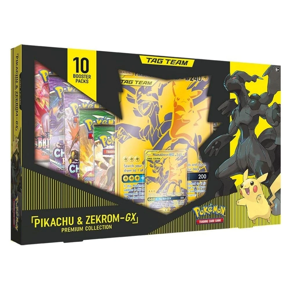 TAG TEAM pairings like Pikachu & Zekrom-GX are totally in tune with each other, able to work together to multiply their attacks into an unstoppable series! The Pokémon TCG: Pikachu & Zekrom-GX Premium Collection puts all that power in your hands—ready to battle and ready to win!