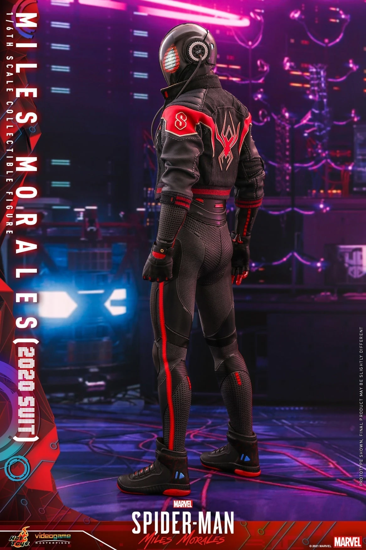 The highly accurate Spider-Man figure is crafted based on Miles Morales in 2020 Suit from the video game, includes a newly crafted masked head with LED light-up function and multiple interchangeable eyepieces for different expressions; a newly developed body; 2020 Suit with LED light-up chest panel to recreate the signature design; faux leather textured jacket with red Spider emblem; interchangeable hands for signature poses; assorted spider-web effect accessories; and a dynamic figure stand with cybernetic workshop inspired backdrop for a complete display.