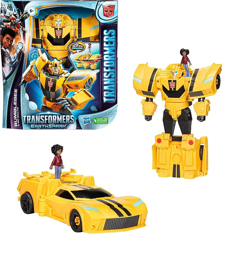 Imagine bringing to life the human-robot connection seen on-screen with the Transformers: EarthSpark Spin Changer Bumblebee and Mo Malto action figures! Transformers: EarthSpark introduces a new generation of Transformers robots – the first Transformers bots to be born on Earth. Together with the human family who welcomes them in and cares for them, they’ll redefine what it means to be a family.  Begin the Bumblebee toy conversion from vehicle to robot mode with 4 manual steps, then connect the Mo Malto human figure to the robot shoulder to trigger the rest of the conversion in an exciting spinning move! Manually convert back to vehicle mode in 11 steps.
