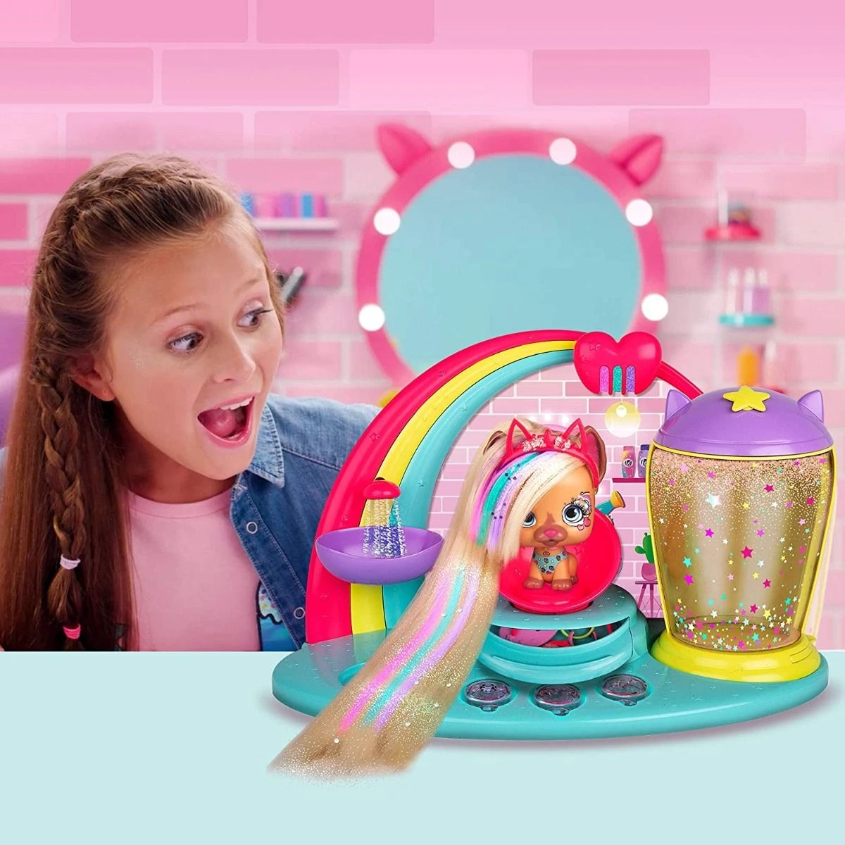 Fabio & Fabia’s Hair Salon is the most fabulous place to be in the VIP Pets world! Now you too can help style VIP Pet Kiara! Are you ready to style your VIP? Start in the hair washing station with real water. Sit your VIP in the styline chair and comb her looong hair. She can also look at herself in the mirror and so can you! Use the rainbow comb to color her hair.and yours! And for the final touch. use the glitterizer to add glitter on your VIP Pet’s hair, just like in the web series! Over 13 accessories to comb and style! You can store them in the handy drawer. Just like a real hairdresser!